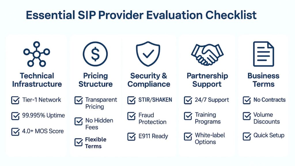 What should I look for in SIP provider contract terms? Prioritize contract-free arrangements without minimum commitments or upfront costs. Flexible terms reduce customer acquisition barriers while maintaining operational agility. Transparent pricing without hidden fees enables accurate customer proposals and sustainable margin development.